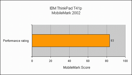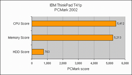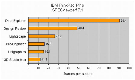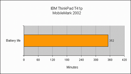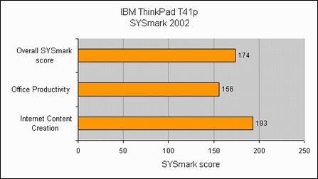 T41p在Sysmark2002测试中的成绩是相当惊人的,达到174。这是在我们测试过的所有机器中最高的速度。当然强大的3D性能和高效率的电池功不可抹。总而言之,你很难再找到一款像T41p如此轻薄的机器有这样的电源表现。