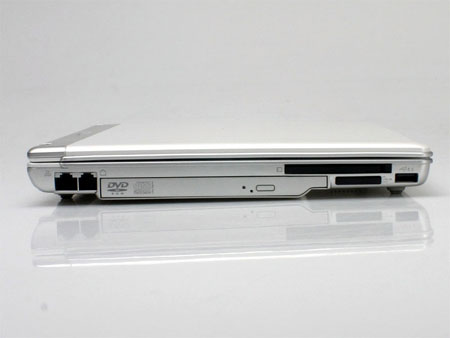 M5200N的前侧显得很简洁利索,采用单扣按压式的屏扣,可以单手打LCD上盖,只是因为边缘太密合,打开时也会有不太方便的情况。M5200N的接口分布在左右后三个侧面,内置的超薄光驱则安置在机身的左侧,在取放光盘的时候会有些不便,不像放置在右侧那样方便自如。因为这个光驱的存在,左侧面的接口只有一个USB、RJ45/11、PCMCIA插槽和一个四合一的读卡器,因为这些接口的外接设备不会存在因为尺寸大小而拥挤的问题,所以这些接口在位置排布上比较密,从图中可以看出。在后侧面,虽然电池是从后方插入安置到主机里面,但在左边还是放置了四针的1394接口,右边则是电源的插口中。在右侧面,还有2个USB,VGA输出,和音频的输入输出接口,中间是CPU风扇的出风口。