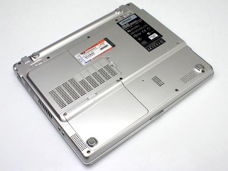 M5200N的底面比较简单,受光驱的影响,底部是后半部分平面比前半部分高出一些。扩展方面,具备两块小盖板,硬盘和内存,用户可以任意升级更大容量的硬盘或是内存。有散热窗格那块盖板则是提供内存升级用,而下方的这块盖板当然就硬盘了。