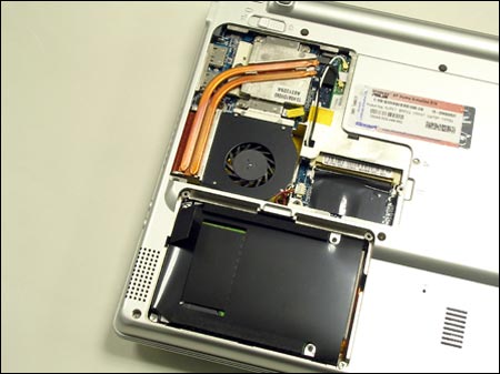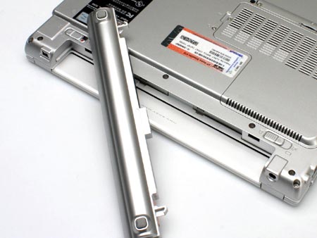 打开这两块盖板,可以看到明显的一点,就是M5200N只预留一个内存扩展插槽,在插槽的下方,还有集成在主板上的内存芯片,所以标配的256M内存是集成的。内存扩展插槽是SODIMM类型,所以,市面比较多的MicroDIMM插槽类型内存还不行,还得专门用SODIMM接口的内存才行。硬盘是用黑纸的塑料纸包起来,并且在边缘有软质塑胶垫,对硬盘起到防震保护作用。