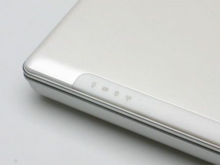 M5200N的上盖表面处理得很棒,使得莹白色的表面不仅看上去很漂亮,拿在手上的感觉也是不一样。而ASUS的LOGO标志则放在最下边缘的中央位置,前端边缘衬上一块约1cm宽亮银色半透明边框,在左端标识有状态灯,这是因为位于主机上的四个状态灯可以直透到这里,可以让用户清楚地知道机器在合上时所处的状态。