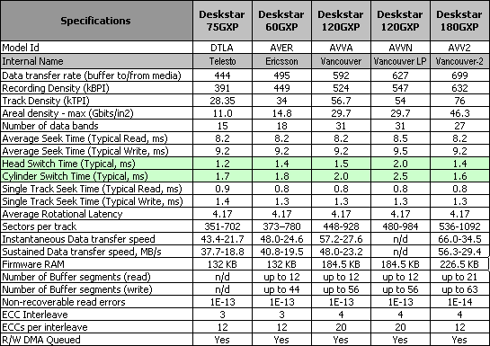 从公式我们可以看到磁道的切换时间会影响线性读取速度,因此我们看到新款硬盘大大降低了这个速度,从而提高整体性能。我们从IBM几款硬盘的发展来看磁头切换时间有一些变化: