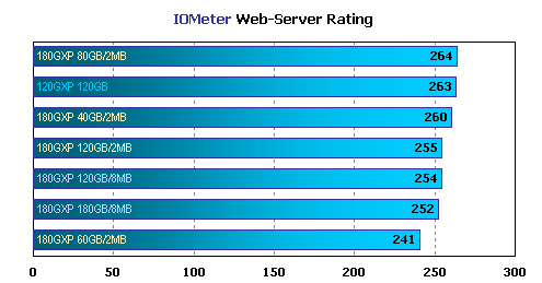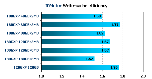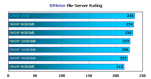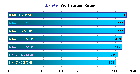 在这里60GB版本依旧落到了最后,此外比较奇怪的就是具有8MB缓存版本的硬盘速度都落到了后面,而120GXP硬盘的表现居然是最好的。