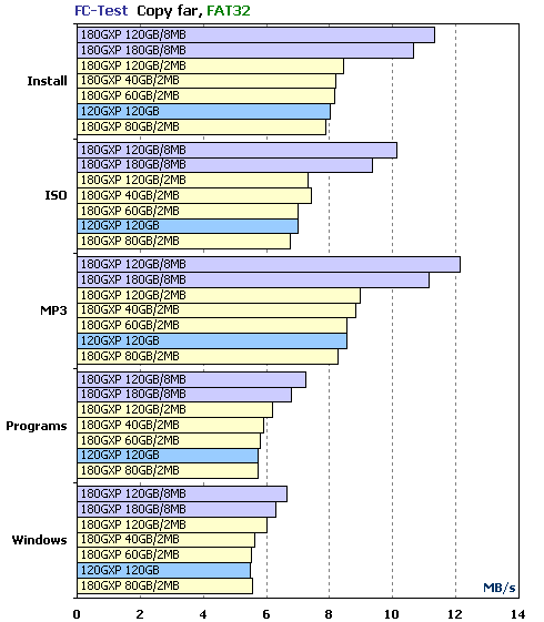 然后我们来看看FAT32下拷贝文件的测试,从表现来看8MB缓存版本拥有比普通版本好20%的性能,而且120GXP硬盘的效率则落到了最后,从以上的一些测试来看决定硬盘最终表现的还是需要看fimeware的算法。
