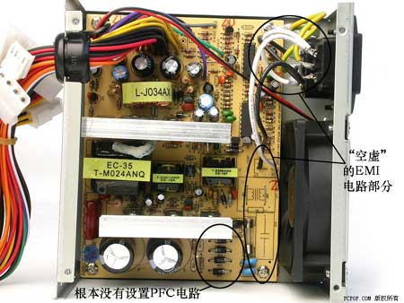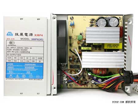 更有甚者,极少数厂家目前竟然仍然在生产和销售完全不具备EMI和PFC电路的“0+0”电源。在我们购买的数十款电源中,技展300PX(3C)电源和百事得300ATXP4电源就是这样的产品。