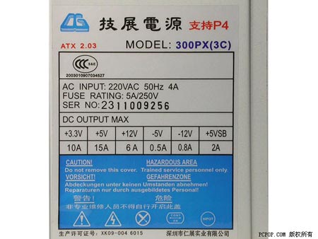 上图可见,技展300PX(3C)电源,虽然在铭牌标记方面无懈可击,通过网络查找法也能够找到同证书号相对应的型号。然而打开机壳以后,电源内部却空空如也,完全不见EMI和PFC电路的踪影!编辑可以肯定地说,这样的电源是无论如何也不能通过“3C”认证的。至于它是如何获得证书号,我们不得而知。最可怕的是这种电源居然可以堂而皇之地在铭牌上标记为“3C”电源在市场里招摇过市!