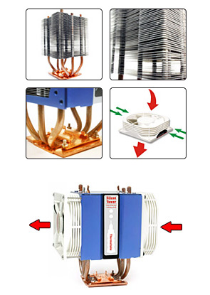 散热器采用新的散热技术,SilentTower拥有一个纯铜的底座,连接这3根铜制的热管,上面是86x80x138mm的散热鳍片组,一共拥有59个鳍片。搭配的风扇很特别,和以往只吸入同一方向空气不同的是,这款风扇将被设计可以吸入来自不同方向的空气。