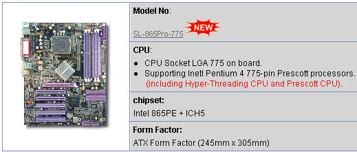 这张型号为SL-865Pro-775的主板采用了I865PE + ICH5,支持AGP 8X及Dual Channel DDR 400,对于新一代LGA 775处理器初期只有800Mhz来说是卓卓有余。看来i9xx芯片组的销售情况会受到很大的影响。