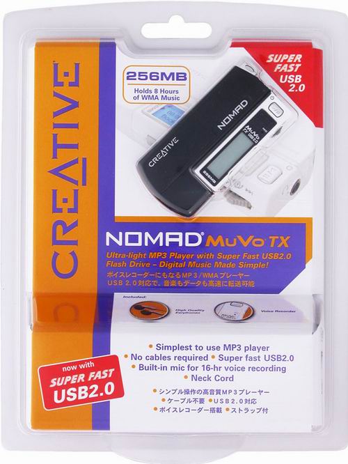 这次新推出的NOMAD MuVo TX其实是2003年8月发售的NOMAD MuVo NX的2.0版本,由于接口从USB1.1提升到了USB2.0,所以数据传输速率大为提升,一节七号碱性电池可以连续播放14个小时的128kbps MP3音乐(NOMAD MuVo NX为11个小时),而播放64kbps WMA音乐也可以达到11小时(NOMAD MuVo NX为9个小时)。除了以上的区别以外,其它性能都继承了NOMAD MuVo NX。