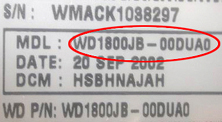 如图所示,主编号WD1800JB表示这款硬盘容量为180GB,转速为7200转并具有8MB缓存的Ultra ATA100接口的产品。附加编号第一部分的00说明这块硬盘是零售产品,单碟容量为66GB,Firmware版本是A0。