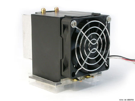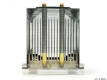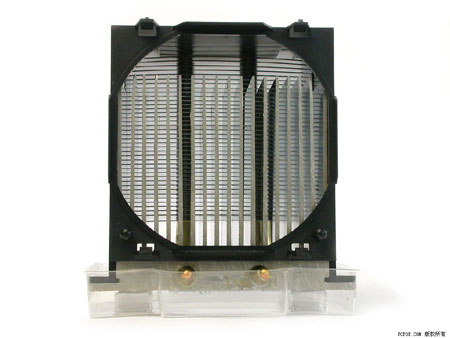 这里我们可以注意到,散热片前半部分的垂直散热片并不是很密,仅仅只有18片,这样做的目的是为了让风扇工作时所吹出的冷空气能够顺利的吹到后半部分水平鳍片中。如果前半部分的垂直散热鳍片过密的话那么就会严重影响到冷空气流动,最终造成不良结果。这样周全的设计,不得不让我们佩服AVC的设计能力。