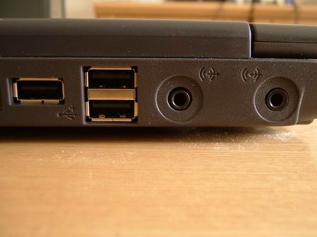 MIC接口和耳机接口设计在机器的左后端对于习惯使用短线耳机的朋友而言是个不公平的设计,因为如果将短线绕过屏幕勉强戴在耳朵上脑袋也会与屏幕做一个不情愿的“KISS”动作,而令无奈的消费者必须为一部本本而另配一款耳机。