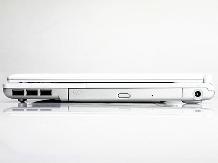 毕竟M210是一款12寸的小机型,所以侧面如果内置光驱的话,基本上就占用大部分的空间,更何况这是一款12.5mm规格的光驱,从上图可以很显示看出,摆布在右侧前端位置的三个USB接口实在是有些拥挤。与左侧面相对很宽松的空间来说,组件在位置的设计上考虑欠妥当。虽然三个USB接口在现在来说,数量很符合实际用途,但如果能够分开三个USB的位置,就不会出现如下图的情况了: