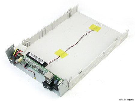 在CRW-5224A-U的外壳上我们看不到一颗螺丝。从机身两侧的卡口撬开组成外壳的上下盖后我们看到内置的CRW-5224A刻录机由4个螺丝固定在底盖板上。机身后部的转换模块相当紧凑,有效节省了空间??使得CRW-5224A-U看起来不像其他桌面型外置刻录机那么庞大臃肿,桥接芯片同样是Cypress半导体的InSystem ISD300A1。
