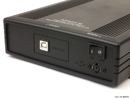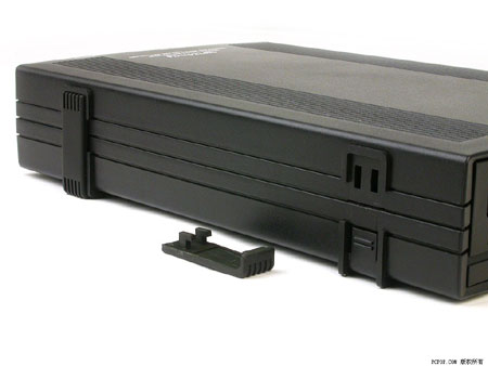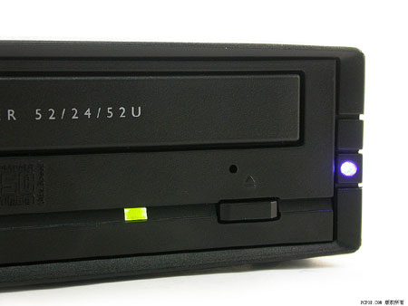 PX-W5224TU采用了通体黑色的四方外观,顶盖两侧有防滑的纵向条纹,底部的橡胶垫脚沿机身两侧向上延伸,除了防滑减震的作用之外,既能连接上下盖板,又使得这款产品能够直立放置使用。由于内置的PX-W5224TA刻录机前面板采用了单键单灯设计,因此PX-W5224TU在前面板右侧的外壳上设计了一个蓝紫色的电源指示LED,刻录机接通电源后它就发出蓝紫色幽光,在昏暗环境下格外有情调。