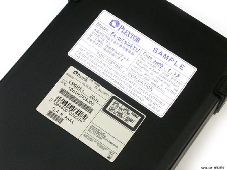 从底部铭牌可以看出,送测的PX-W5224TU是一款样品(Sample),2004年1月出厂。这款产品沿用了浦科特传统的黑色托盘,通过减少激光乱反射改善刻录品质,带有支持直立放置使用的卡子,前挡板内衬黑色防尘减震海绵。由于是测试样机,因此附件非常简陋,除了必需的线缆外只有一张PlexTools Professional的CD-ROM盘片。