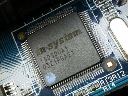 对PX-W5224TU的拆解进一步加深了我们对浦科特的赞叹和钦佩。在外壳上,我们没有发现一颗螺丝??上下两片盖板的连接完全由4个硬质橡胶垫脚实现,精细的模具也确保了接缝处的密合。颇费一番周折之后我们卸下了盖板,通过4颗螺丝固定在下盖板上的内置的PX-W5224TA和用铁片屏蔽转换模块呈现眼前。和前面所有产品相比,PX-W5224TU的转换模块显得格外精致,考究的做工令我们赞叹:不仅所有的连线都做好工整的接头,80pin的IDE数据线也是这次测试中所仅见,分割处理更有助于减少信号的串扰。和多数其他产品一样,PX-W5224TU也采用了Cypress半导体的InSystem ISD300A1作为桥接芯片。