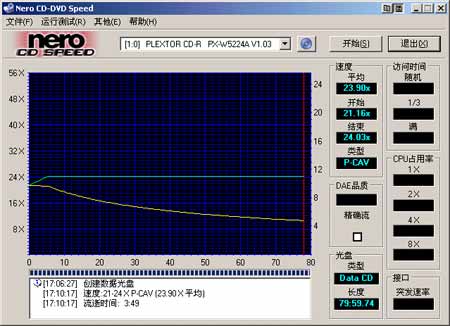 Nero CD-DVD Speed的“写入传输速率”测试表明,这款PX-W5224TU不仅“品质为王”,性能也同样出色。对于两款24×CD-RW盘片,它都能够从21×左右起步,在4~6Min处之间就达到24×,并以CLV方式保持到最后。整个过程以P-CAV方式完成,平均传输速率23.89×,属于52/24/52规格刻录机的较高水准,对盘片的兼容性也值得肯定。