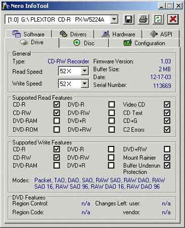 图为:Nero InfoTool 2.07提供的驱动器信息