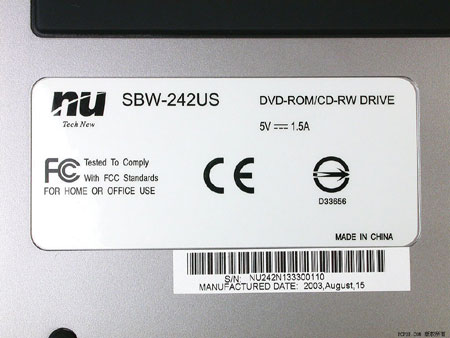 由于此前已经有过详尽的评测,在这里我们就不在它的外观上多费笔墨。从结构上看,SBW-242US和AOpen的ESV-189u一样,也是一款典型的薄型康宝驱动器衍生产品,只是它的机芯并没有采用可抽换的设计。从软件识别的情况来看,它的机芯同样来自广明光电,我们推测是ESV-189u所采用的SBW-242的改进型号,对CD-RW的擦写速度从10×提升到了24×??从产品编号和相对简陋的铭牌我们不难看出,作为由强势OEM厂商所主导的新生品牌,NU的产品仍然保留了比较浓厚的OEM色彩。SBW-242US的包装附件也同样具有上述特点,除了必要的线缆之外,只附带了一张24×的空白CD-R,和建基、华硕的豪华包装相比显得有点“寒酸”。