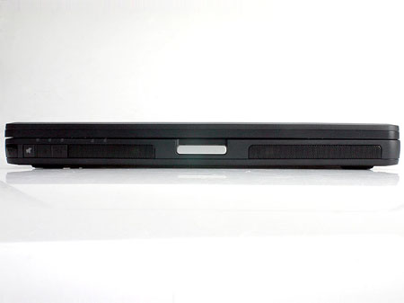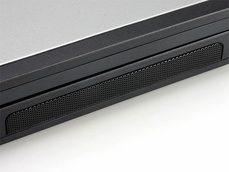 前侧面特别显眼的就是其有点霸气的两个音箱,还有中间用金属色点缀的屏扣按钮,两者设计手法都显得非常大气,充满豪气。侧面看上去很平整,没有进行非常明显的圆角润边处理,棱角分明,这种设计可以表现其庄重严肃气质,风格上非常适合所面向的企业用户办公场合。值得注意的是,用户不要被其宽宽的音箱金属孔罩网所误导,其实其JBL音箱没有这么大,只是求美观效果而拉得很宽,但音响效果相对笔记本来说足可以把你征服。