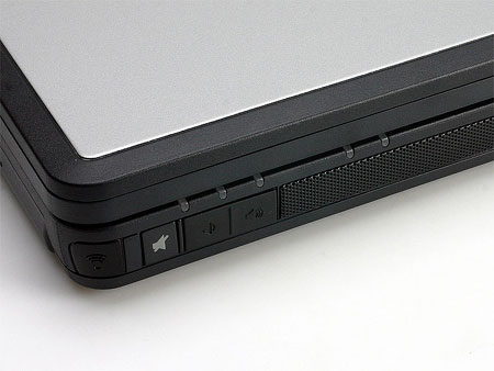 在左端接近转角处,有三个音量按控制键,静音以及声音增大减小三个按键,这样用户在控制声音时比打开操作系统中的音量控制面板方便了很多,静音键则设计得有特色,在静音状态时,键上面的标识发出红光。在过度到到左侧面的圆角处,是V1007的红外线感应窗,这些受距离和空间限制的设备还是安置在用户容易操作地位置比较好,在有些本子里面,红外线都会安置在后侧,这样用户使用起来会非常不便,但如果本子与本间通过红外进行通讯的话,最理想的位置就是在后面,但现在采用这种通讯方案应该会相当少了。