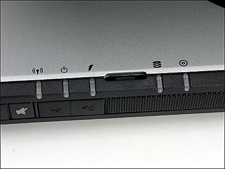 在腕托的前端边缘处,有五个运行状态的LED指示灯,从上面的标识也就可以看出来其各自所代表的状态。从左端开始依次是:无线网卡电源、本机电源、电池充电指示、硬盘运行、光驱运行。这五个LED状态灯因为露出一点在前侧面,所以,即使在合上LCD上盖的情况下,也能通过这些指示灯的状态知道本子的运行状态。