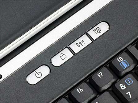 上图是位于键盘前方中端位置的开关键以及三个热键。与其它品牌的本子不同的是这三个热键不是对应的IE、OUTLOOK这样的应用热键。在HP提供的热件驱动后,这三个键从左到右依次所对应的功能是:待机、无线网卡开关、外接演示。可能对于第三个外接演示你还不是清楚,其实是这样的,通过其HP的Quick Launch Buttons管理程序,可以指定一个要演示的程序,然后设定外接显示设备的显示属性,设置好后,连接外接显示设备,就可以进行单个程序投放到外接显示上面进行演示。这与我们的直接VGA输出完全不同。