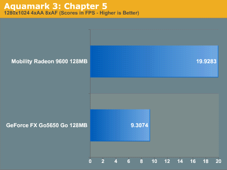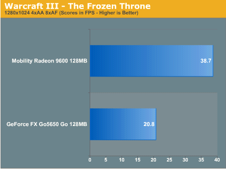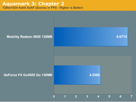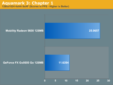 虽然在GeForce FX Go5650上已经可以获得相当流畅的游戏效果,但得分显示Mobility Radeon 9600领先GeForce FX Go5650约86%。在我们开启AF和AA后,ATI更扩大了领先优势。