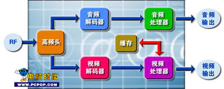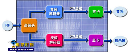 模拟的音频和视频信号从高频头输出后,需要经过专门的芯片处理。在电视卡上,视频信号通过解码芯片(Decoder)将其转换为数字信号,然后对信号做相应的处理后,经PCI接口和系统总线(BUS)传送到显卡上。此时显卡会将其转换成适合PC显示器输出的信号,一般这个过程中还有一个数/模转化的过程。而音频信号要经过音频芯片进行处理,然后通过PCI总线传送到声卡上,声卡对进来的音频信号进行处理,然后通过音箱输出。