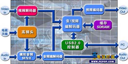USB电视盒与PCI电视卡的工作流程基本相似,只不过信号不是通过PCI总线,而是通过USB控制器,将其传送到显卡和声卡的,然后分别输出的。具有硬件压缩功能的USB电视盒,在硬件压缩的时候,需要把通过解码芯片的视频信号和音频信号根据相应的格式进行视频编码,然后通过USB接口进入系统,使用软件进行存储。