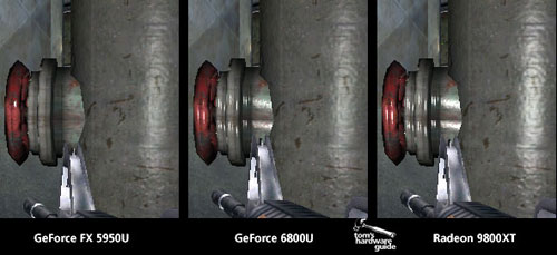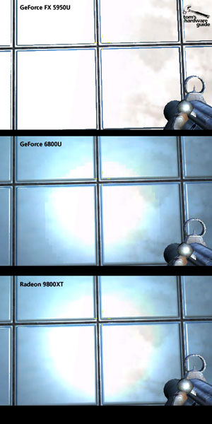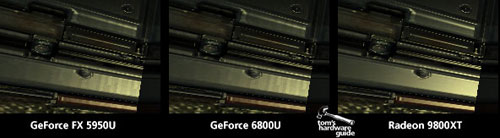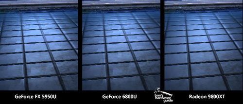 随着GeForce 6800系列产品的正式推出,权威性最高的网络媒体之一 Tomshardware 也对它进行了详尽的测试。虽然在测试所得出的数据上GeForce 6800 Ultra以压倒性的优势战胜了上一代产品GeForce FX5950 Ultra和Radeon 9800XT,但是它在画面质量上表现却受到了Tomshardware的批评。 在测试的最后,Tomshardware进行了详细的Anisotropic与FSAA画面质量测试,同时其中的Shader渲染质量对比也引起了我们的注意,下面的全部截图均来自于Tomshardware。     也许是为了在性能上彻底超越竞争对手,GeForce 6800 Ultra目前在FarCry和AquaMark 3等测试游戏中还没有完全使用达到微软DirectX9标准的24bit以上精度。虽然nVIDIA这次在性能测试中取得了大幅度的领先,但是在Shader的渲染精度上仍然同Radeon 9800XT有非常明显的差距。 因此可以说nVIDIA所宣称NV40拥有的32bit模式似乎并没有使用上,目前它仍然使用的16bit精度,所以在Shader渲染方面的结果要差一些,同时画面质量也与R3XX系列仍然存在一定差距。
