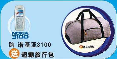 3、从即日起至5月20号,凡购买诺基亚3100的用户, 可获赠超霸旅行包。