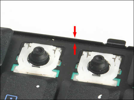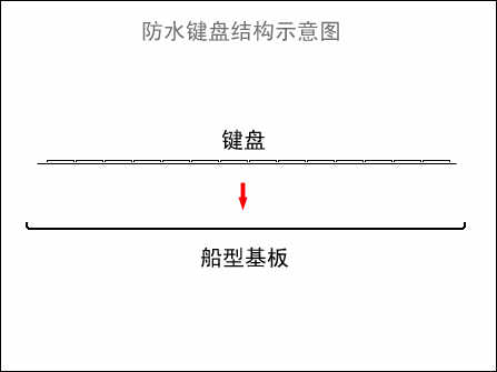 ZT3000的防水设计则是比较典型的船形基板,基板背面又贴有一层透明的塑料薄膜,当用户不小心把水溅到键盘里面的时候,可以防止一定量的水进入到机体内,当水在键帽下面蔓延到键盘边缘时,微微翅起的边缘会阻止水从边缘渗漏到机体内部。这是ZT3000这块键盘的防水设计结构原理。在现在大多数的键盘上图所指的翅起的边缘省掉了,虽然按键下面进行了密封处理,但当不小心溅到键盘上的水量较我时,向键盘边缘蔓延,水还是会从边缘的缝隙渗漏到机体内。