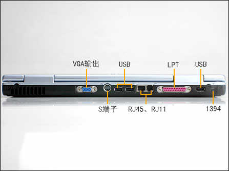 这是在主机的后侧的接口,除了USB接口在布局上面考虑有些欠周到以外,还有RJ11与RJ45的接口的卡簧位置方向上也有疏漏之处。RJ45/RJ11两个接口位于主机后侧,本来就给用户插拔有些不便,再加上接口的卡簧向下,要拔下网线或是电话线,用户就必须把本子拿起来才可以完成。这两个方面,还有待HP在以后的机型里面得到改进。