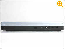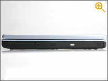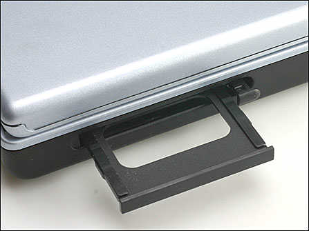 ZT3000的左侧面只放置了一个PCMCIA卡插槽接口,前半部分基本被12.5mm尺寸规格的光驱占掉了,因为这个光驱,在左侧没有放置更多使用频繁的接口也就理所当然了,PCMCIA采用的是TYPEII插槽类型,不能兼容TYPEIII类PCMCIA卡:
