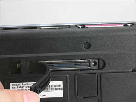 ZT3000的底面,内容看上去很丰富,在升级扩展方面,内存、硬盘、miniPCI插槽都可以直接打开盖板,来进行升级或更换。ZT3000在底端预留一个SO-DIMM插槽,最大支持1GB容量内存,扩展的空间相对已经很足够了。如果用户觉得还不够的话,那就要动用被标配内存占用了的另一条插槽了,也就是在键盘的下面。另外,从上图各硬件所处的位置来看,ZT3000腕托下面为电池、硬盘与光驱,那可想而知其主板占用的是主机后半部分的空间,既然如此,那么为何在左侧两侧没有太多的接口布置,从这种硬件的位置布局特点就不难知道其原因所在。即使ZT3000配备的接口已经比较丰富了,在底部还是为用户准备了一个端口复制器接口: