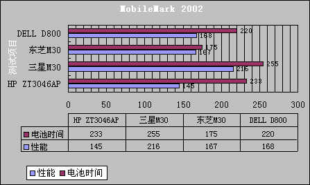 从MobileMark2002测试结果的对比来看,因为硬件配置上有一些相差,所以,Z3046AP在性能上处于下风。在电池的持续使用时间方面,倒是赢得了比较好的成绩。