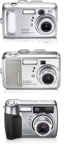 柯达近日宣布了三款EASYSHARE数码相机的问世:四百万像素的柯达DX7440,拥有四倍光学变焦镜头,快速0.2拍摄间隔。五百万像素的CX7530,拥有三倍光学变焦以及多区自动对焦系统、可以连拍九张相片。三百万像素的CX7330,拥有三倍光学变焦和全傻瓜的智能曝光系统。