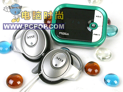 机器正面由大面积的黑色镜面材质构成,在这下面隐藏着一块OLED显示屏,开机以后屏幕上的歌曲名等信息由蓝光字体显示,而其它比如EQ模式等信息则由黄色字体显示。在屏幕旁边是一个五向功能键,操作方便手感到位。而且这款机器还支持开机画面DIY,本身提供了4个画面可以供更换,也可以用附送的软件来自己制作。附机送的耳机是一个耳挂式的,带上之后感觉非常舒服,没有同类产品那么卡。它采用内置锂电池供电,可连续播放14小时。由于配件的丰富,微星MEGA MP3随身听可以选择多种的放置方式,由于某些方案的需要,微星还为这款产品配备了音频延长线,这在其他产品中是很少看到的。