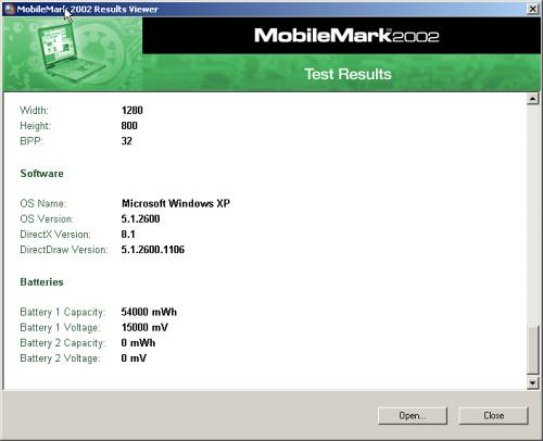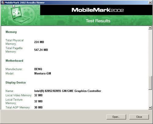 Joybook 6000E的测试平台为:Windows XP Professional+SP1(英文版)、Intel芯片驱动5.1.0.1008、测试软件方面使用了权威的MobilityMark2002、Winstone2001/2002、PcMark2002pro、Sisoftware Standra2003、BatteryMark4.01、3DMark03及Nero 6.0附带光驱测试软件等。除MobilityMark2002测试使用电池驱动外,其余的测试均外接AC电源。