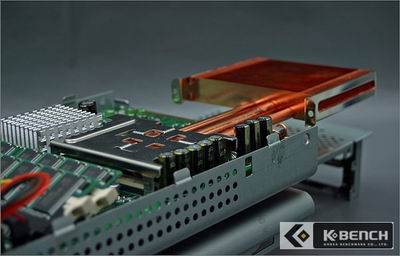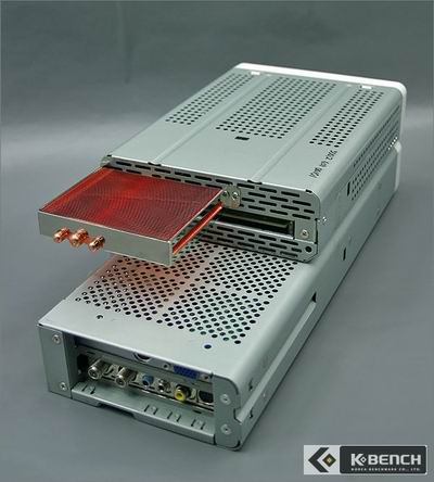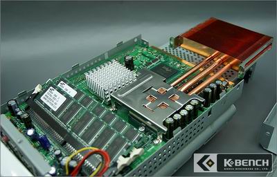 经过特殊设计的主板仅仅和一个光驱的宽度一样,CPU的散热采用了热管配合纯铜散热片的形式,为了将热量散发到模组外部,散热器的散热部分被安排到了模组外部。