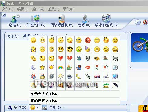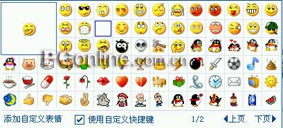 经过统计,我们发现ICQ Lite提供28种默认表情,Yahoo messenger提供48种,Msn Messenger虽然只在面板上看到60种表情,但如果按下“显示更多图释”后就能显示超过60种的默认表情,而QQ则将这种功能发挥到极致,默认的表情就已经有了96个,真是够夸张的。