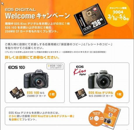 近日在佳能的日本网站上,已经发布了相关的配套赠品活动消息(相关连接为:cweb.Canon.jp/camera/kissd/campaign/welcome.html),宣布从即日起至5月6日止的活动期间内,凡是购买EOS 300D的用户,都将会得到一张价值约为人民币500元的LEXAR 256MB CF存储卡一张,购买EOS 10D的用户则赠送两张。通过赠送CF卡来缓解佳能300D的降价压力,同时还可以利用大量采购赠品的优惠价来弥补价差空间,佳能的这一策略确实是高。
