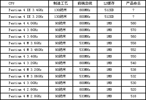 Pentium 4系列处理器命名(5XX系列):