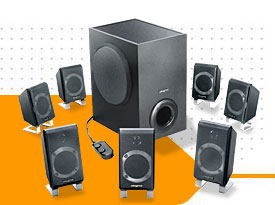为了符合创新SOUND BLASTER Audigy2 ZS Platinum Pro声卡对7.1多媒体有源音箱的需求,笔者为您推荐了一款创新的Inspire T7700音箱。它继承了创新音箱一贯的品质:音色纯美、分离度高、空间感强。配合Audigy2 ZS声卡可以实现Dolby Digital EX/DTS ES影院和EAX7.1游戏音效。除了Audigy2 ZS系列声卡外,T7700音箱还可以连接Sound Blaster Audigy/ Audigy2声卡,通过独有的CMSS技术能将5.1/6.1的音频信号模拟成7.1的效果输出。此外,这款线控不仅集音量调节、电源开关、低音控制、耳机接口于一身,以提供更佳的人机交互性,更重要的是其提供了一个专利的M-PORT数字音频接口,可以连接例如Creative NOMAD MuVo NX等支持此接口的U盘式MP3播放机,无须连接电脑,即可直接播放音乐。作为一款经典的7.1系统,其不仅赶超在传统家庭影院之前提前进入8声道环绕时代,更为多媒体音箱引入了不少高品质、实用、新鲜的技术。