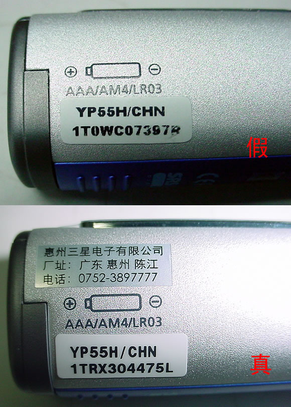 5、水货机身机器号字迹模糊,行货机身机器号字迹十分清晰。行货机身有惠州三星电子有限公司厂址和电话标签,水货没有中文标识。