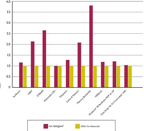从AMD公布的测试成绩来看,Geode NX 1500以1GHz频率工作时性能明显好于威盛的1GHz Nehemiah处理器。