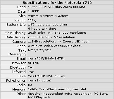 这款手机的定位在高端市场,手机支持现在联通的CDMA,以及AMPS。大小为94*49*23mm,非常小巧,仅重115g。V710的电池还是可以让人比较满意的,185小时的待机时间以及4小时的通话时间。手机的主显示屏采用了262K真彩TFT显示屏,大小为176*220象素,外置屏幕则是普通98*67象素TFD彩色显示屏。手机集成了120万象素、4倍光学变焦摄像头,可以拍摄3分钟的视频。支持MMS/EMS/SMS功能,支持蓝牙功能,Java,64和弦铃声足以满足大多数人的听觉。