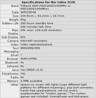 这款手机可以支持三频GSM网络以及GPRS/EDGE,大小为104.5*44.2*18.7mm,重量仅为86g。因为小巧,所以导致无法搭配大容量电池。Nokia 3220的电池仅可以提供280小时的待机时间以及180分钟的通话时间。彩色液晶显示屏为65K 真彩TFT显示屏,大小为128*128象素。手机内置摄像头,可以拍摄最大640*480分辨率的图片。Nokia 3220支持EMS/SMS/MMS功能以及无线上网,支持Java。手机内置4.5MB内存。